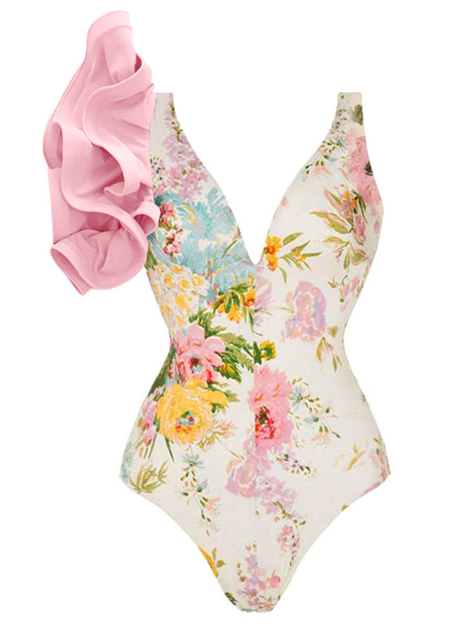 Deep V-Neck Ruffle Print One-Piece Swimsuit