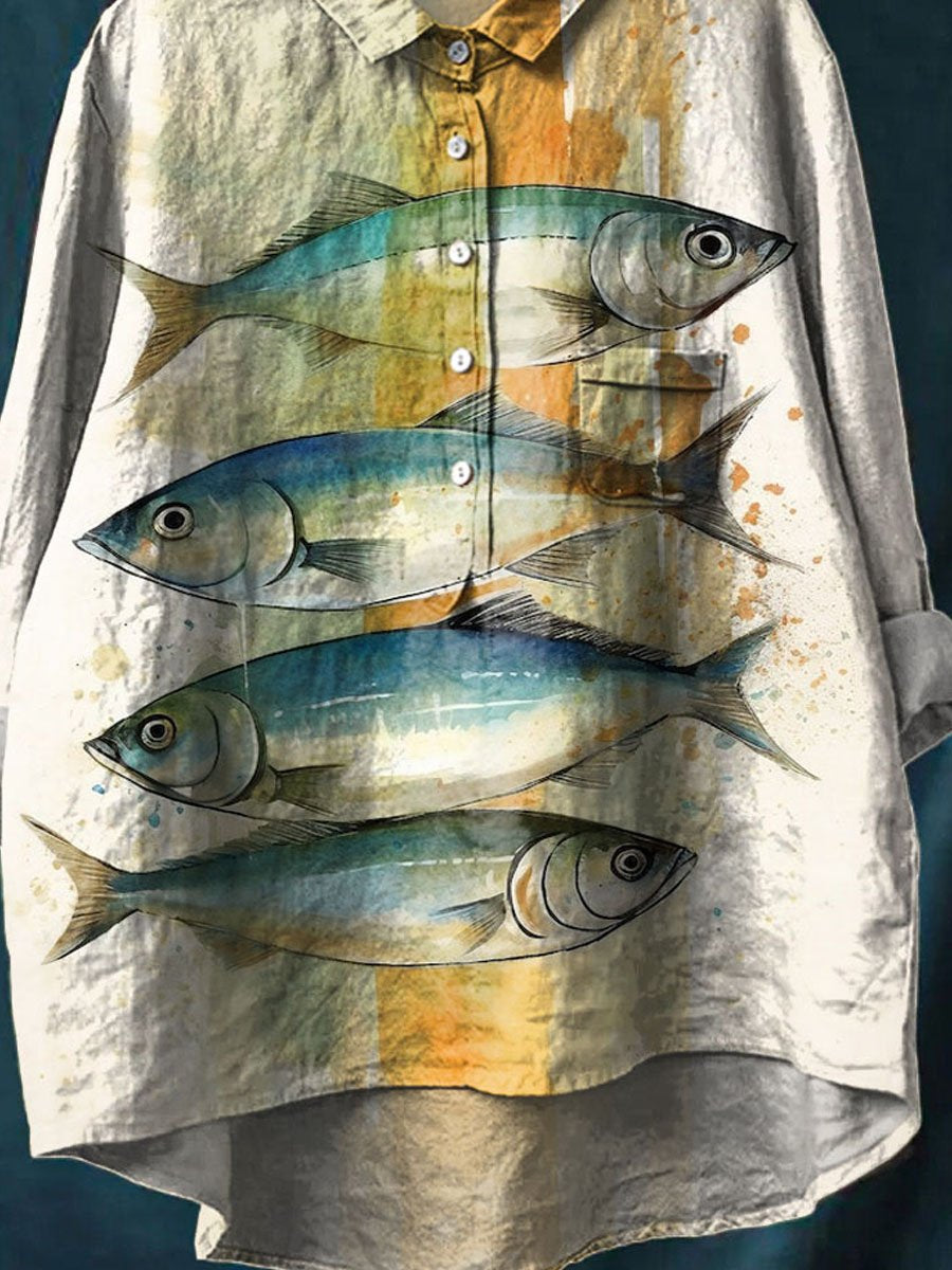 Women's Fish Print Casual Cotton And Linen Shirt