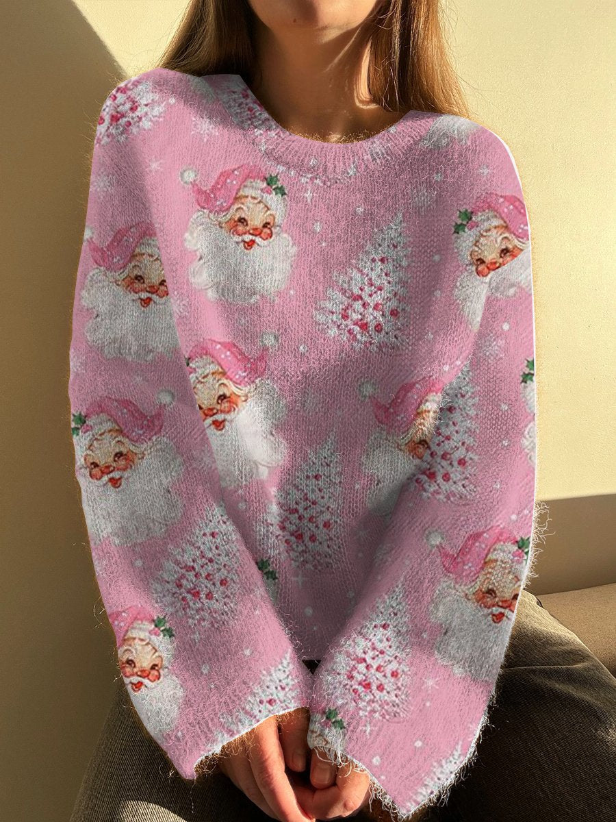 Women's Pink Retro Christmas Illustration Print Sweater