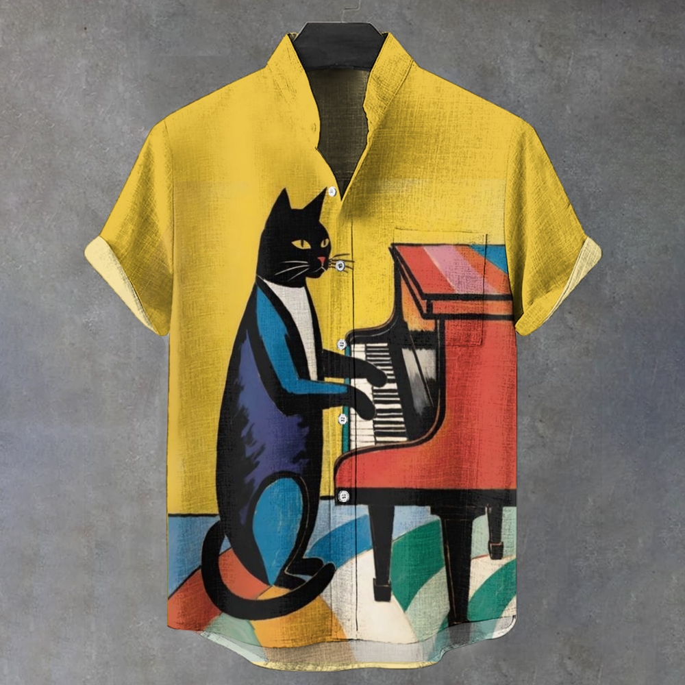 Men's Stand Collar Retro Playing Piano Cat Printed Short Sleeve Shirt