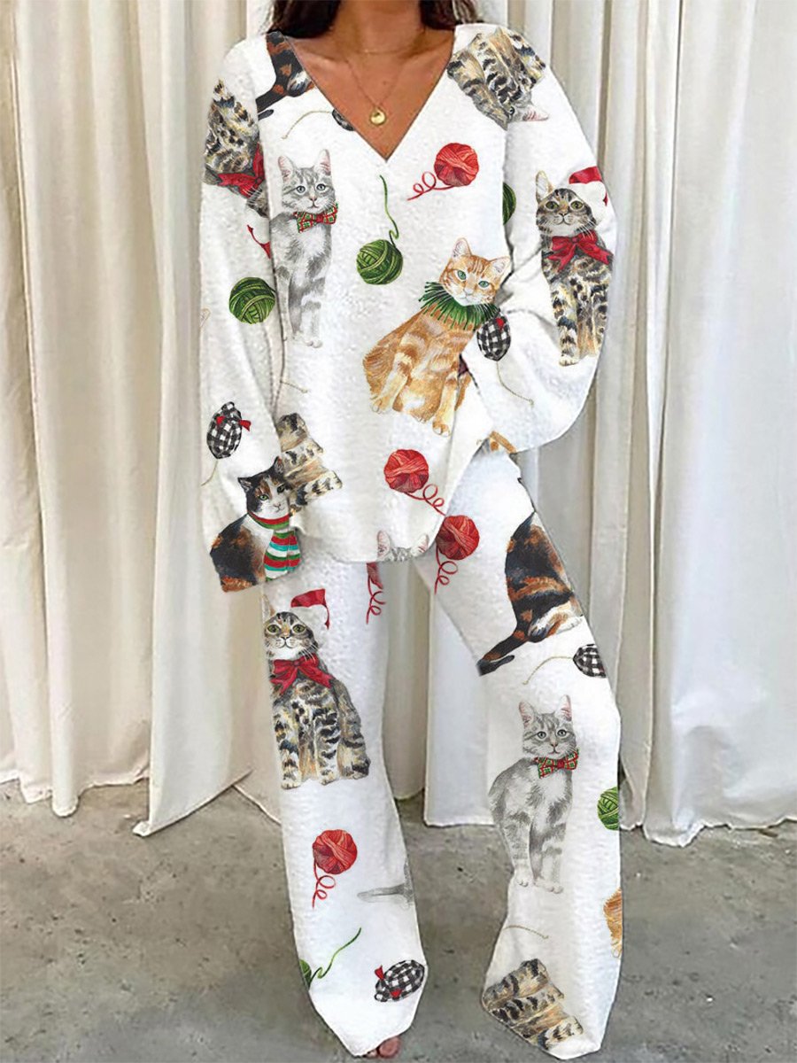 Women's Christmas Kitten Pattern V-Neck Long Sleeve Pant Suit