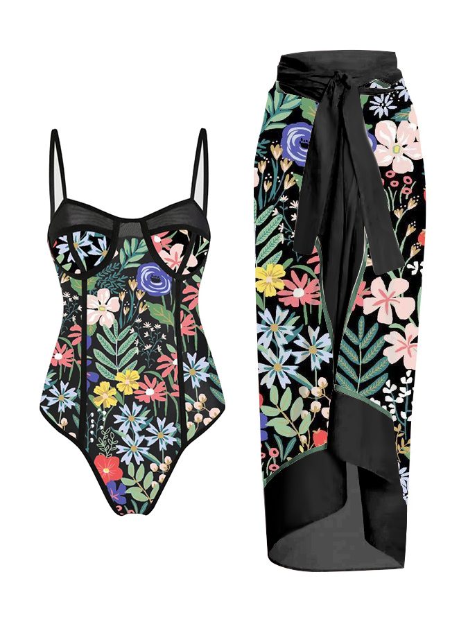 Vintage Floral Print One Piece Swimsuit And Cover Up