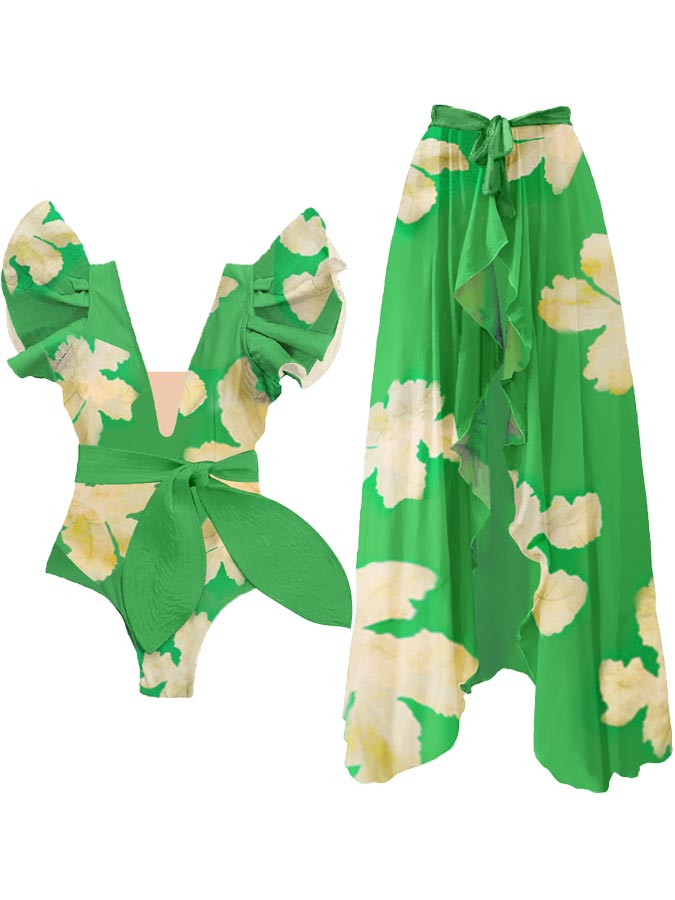 Botanical Print One Piece Swimsuits and Skirt