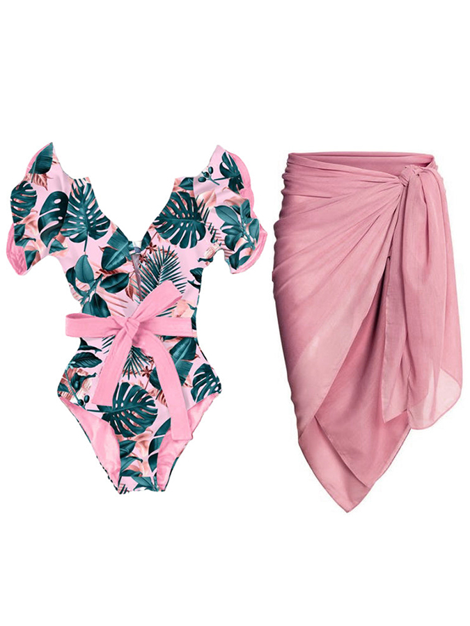 Fashion Print Ruffle One-Piece Swimsuit Set