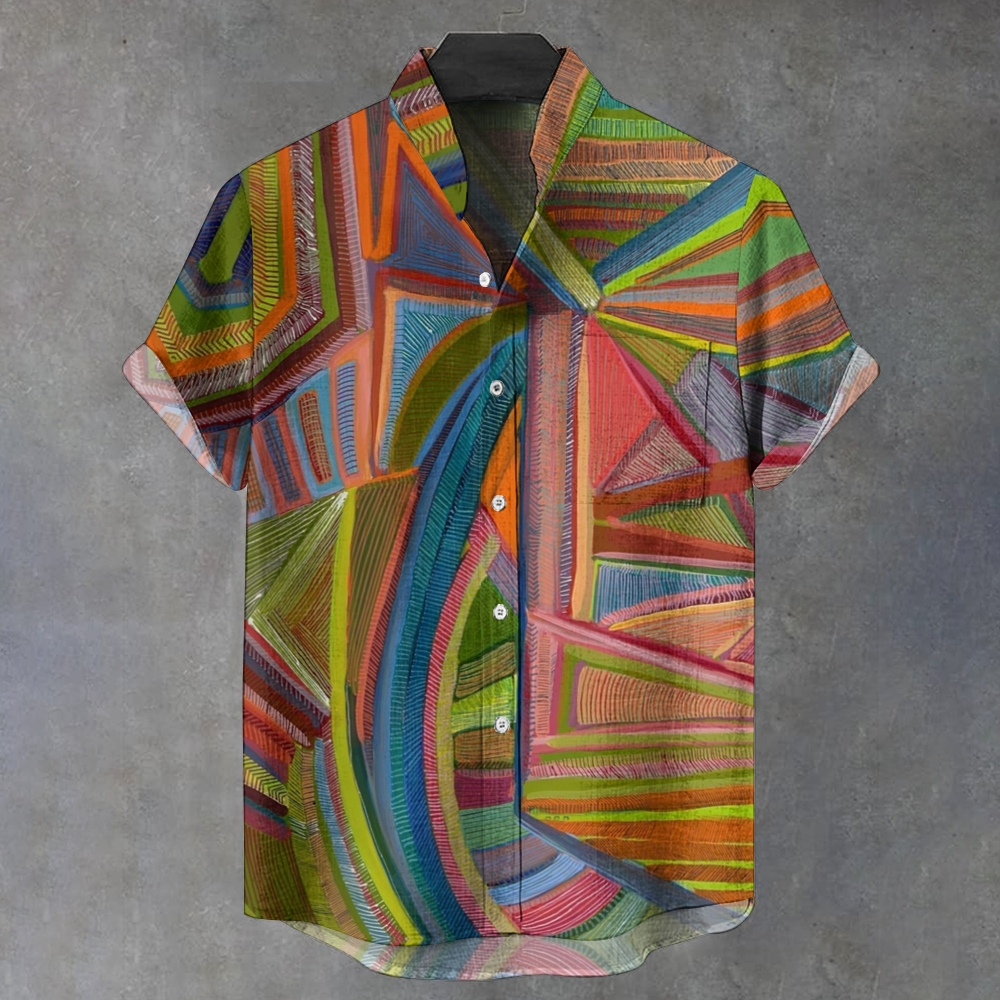 Men's Stand Collar Abstract Geometry Printed Short Sleeve Shirt