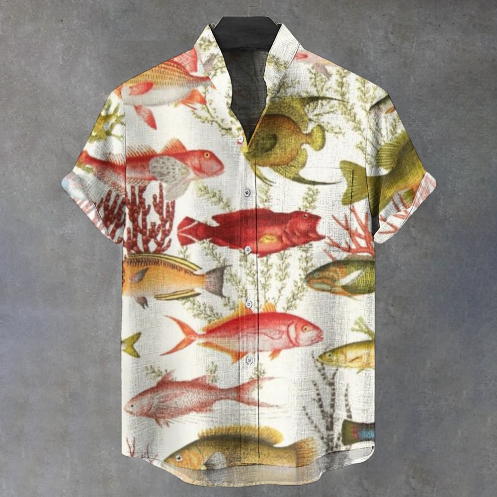 Men's Stand Collar Art Fish Printed Short Sleeve Shirt