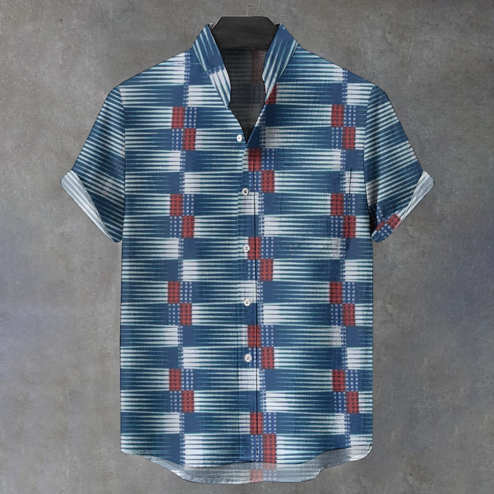 Men's Stand Collar Color Block Stripe Printed Short Sleeve Shirt