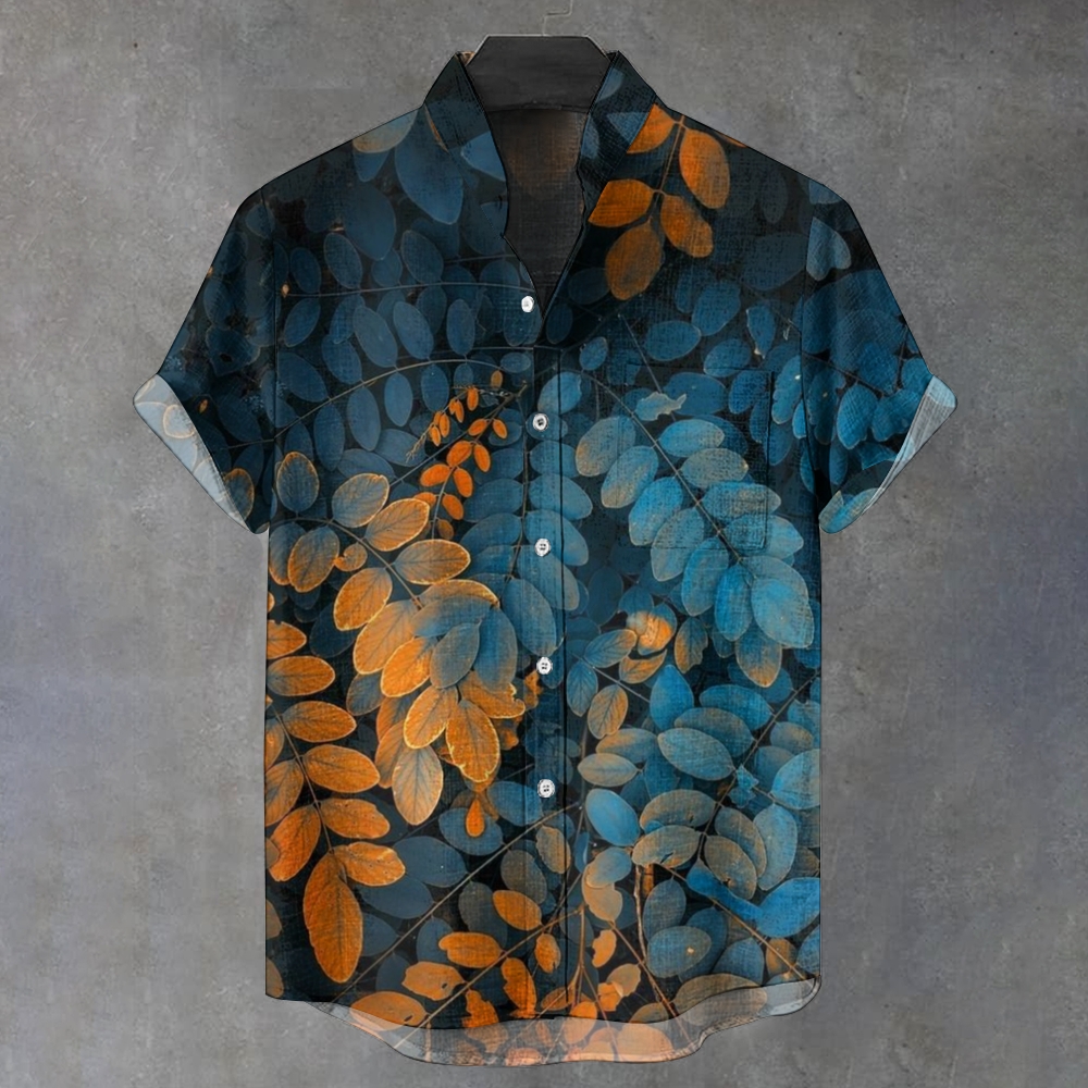 Men's Stand Collar Vintage Leaves Gradient Sunset and Night Print 100% Cotton Long Sleeve Shirt