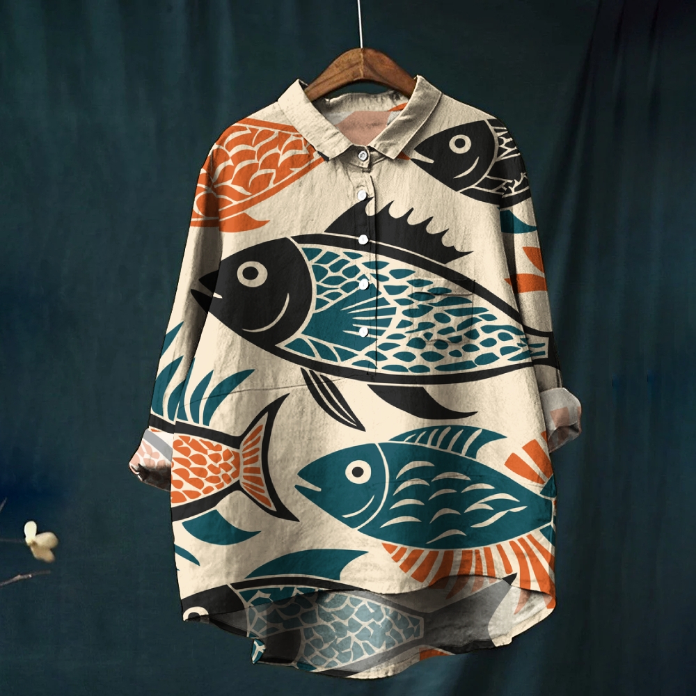 Women's Cartoon Fish Colorblock Print Casual Linen Shirt