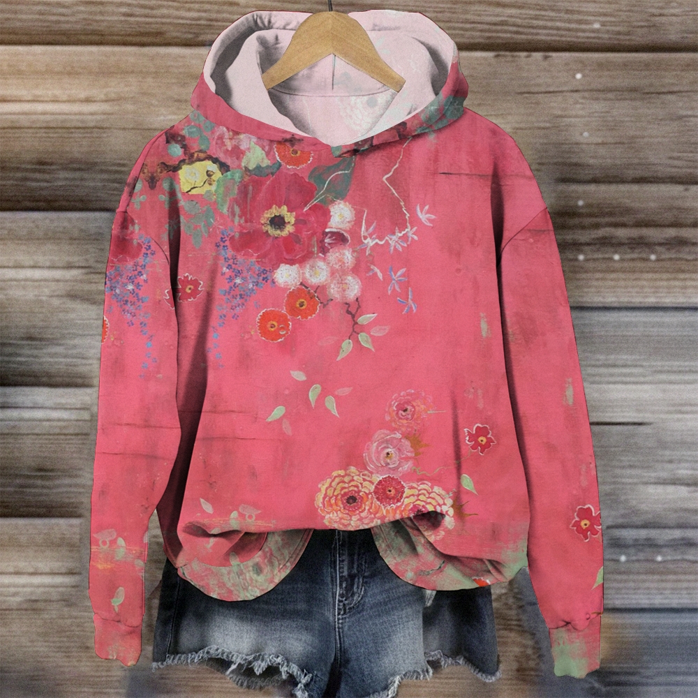 Women's Casual Pink Vintage Flower Printed Long Sleeve Hoodie