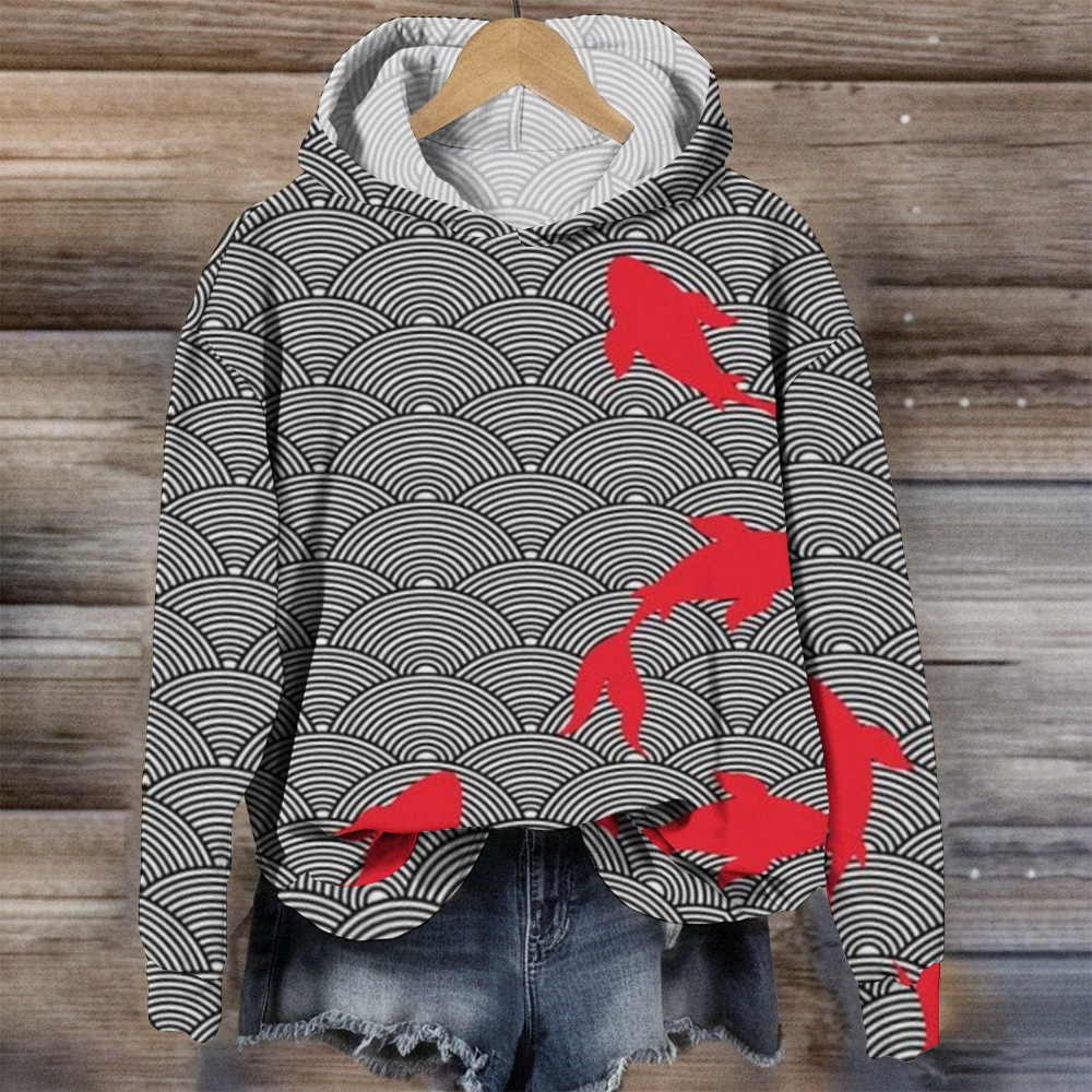 Women's Casual Waves Fish Printed Long Sleeve Hoodie