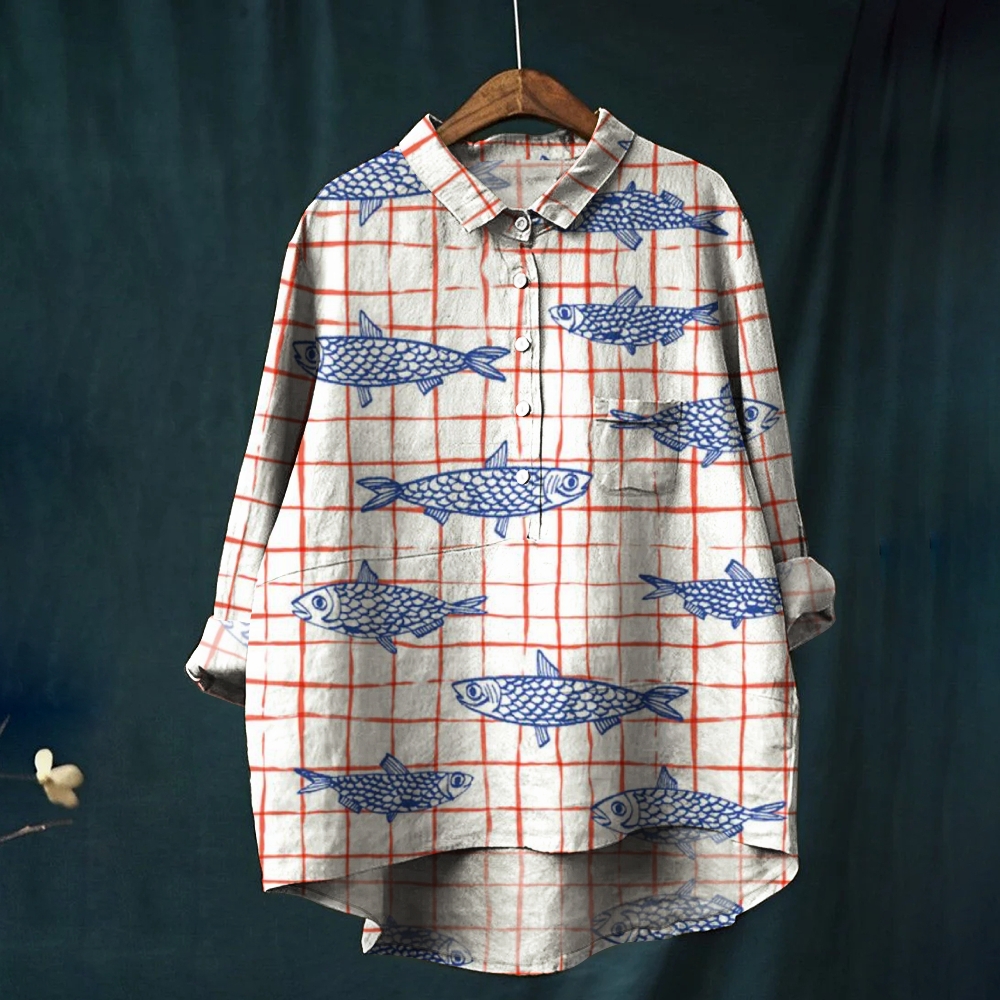 Women's Checkered Fish Line Art Print Casual Linen Shirt