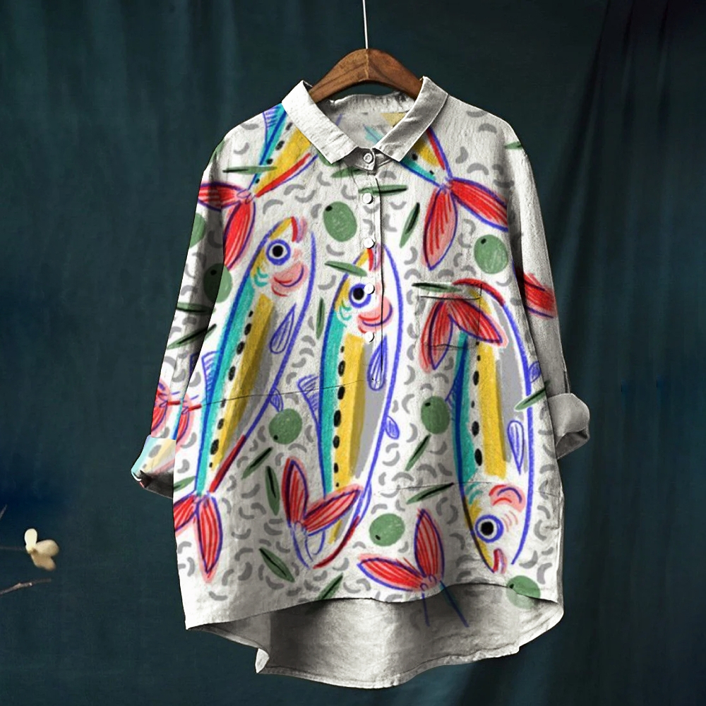 Women's Colorful Fish Print Casual Cotton And Linen Shirt