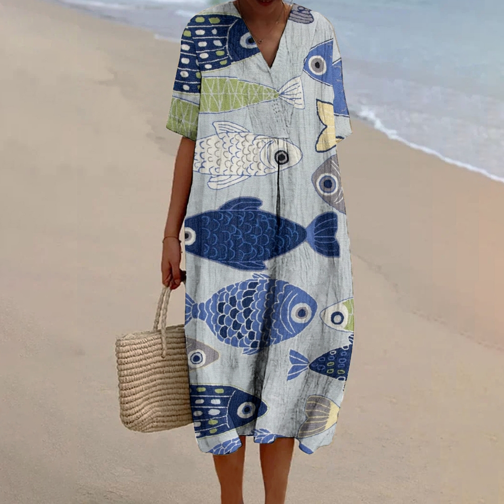 Women's Fish Art Print Flowy Cotton And Linen Dress