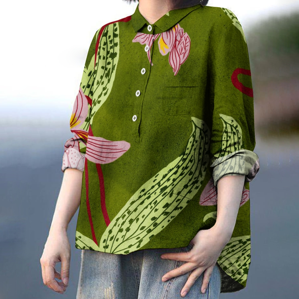 Women's Green Vintage Floral Print Casual Cotton And Linen Shirt