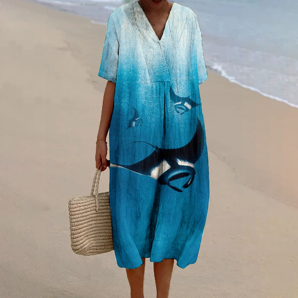 Women's Ocean Manta Ray Print Flowy Cotton And Linen Dress