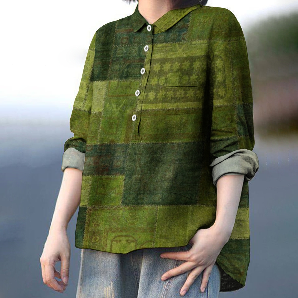 Women's Vintage Green Patchwork Print Casual Linen Shirt
