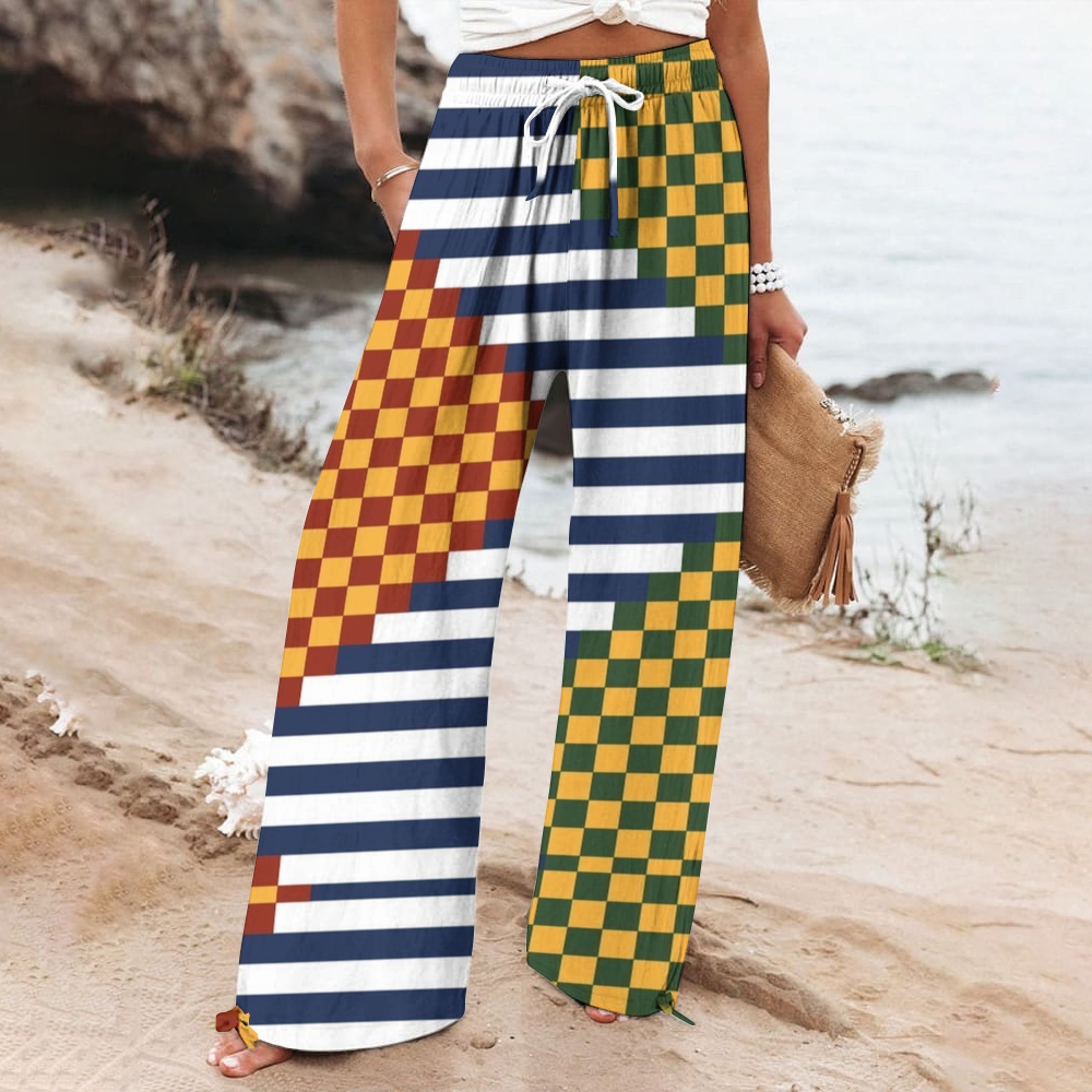 Women's Wide Leg Casual Checks And Stripes Printed Pants