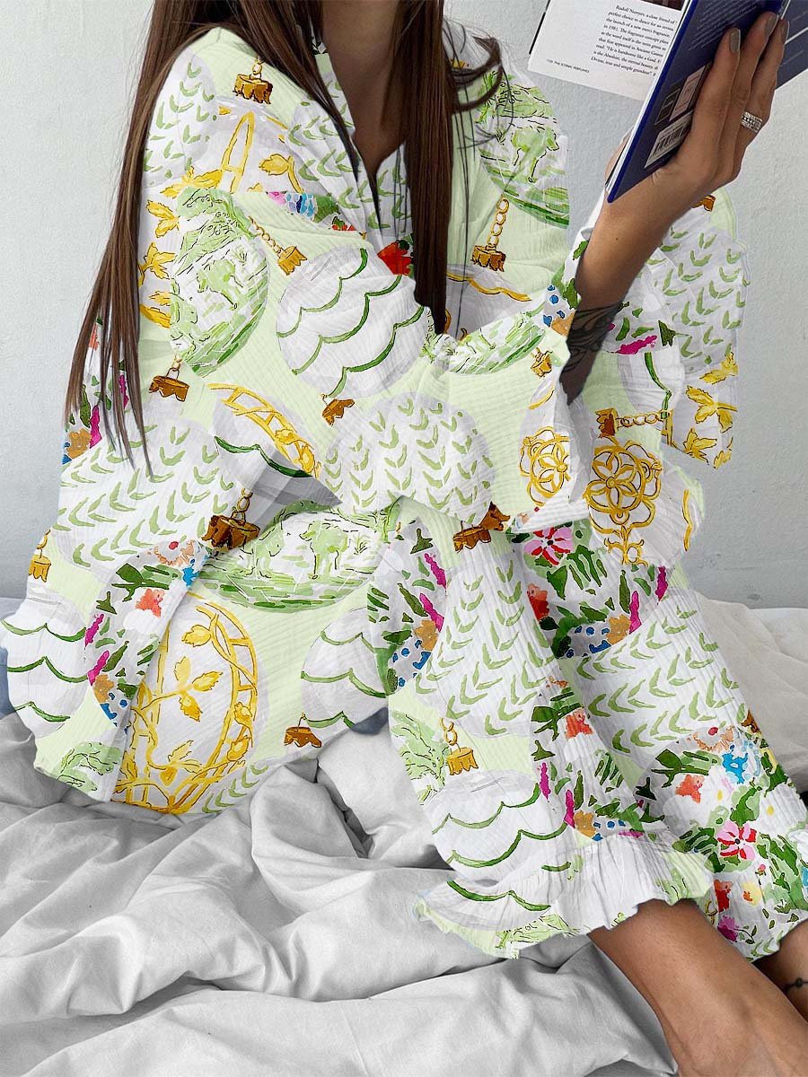 Women's Aesthetic Lantern Watercolor Print Cardigan Linen Cotton Set