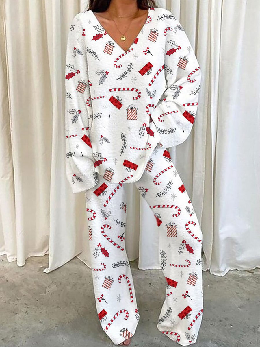 Women's Christmas Candy Cane Fleece Long Sleeve Pant Set
