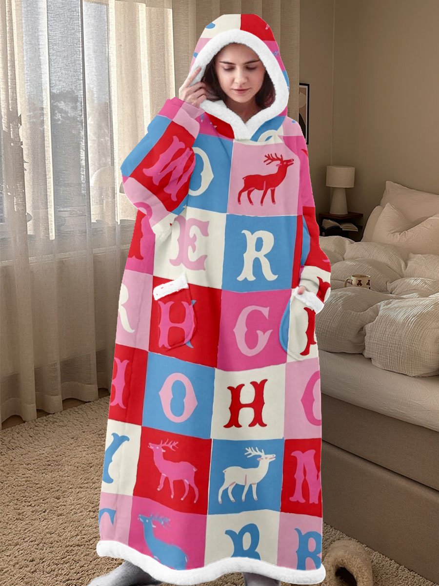 Women's Contrast Check Christmas Lettering Print Pocket Cotton Oversized Dress