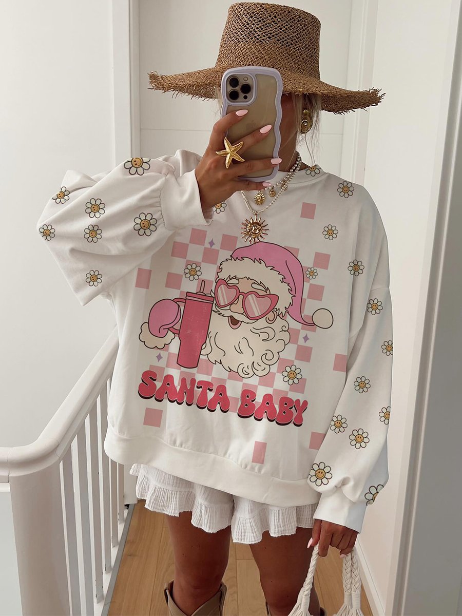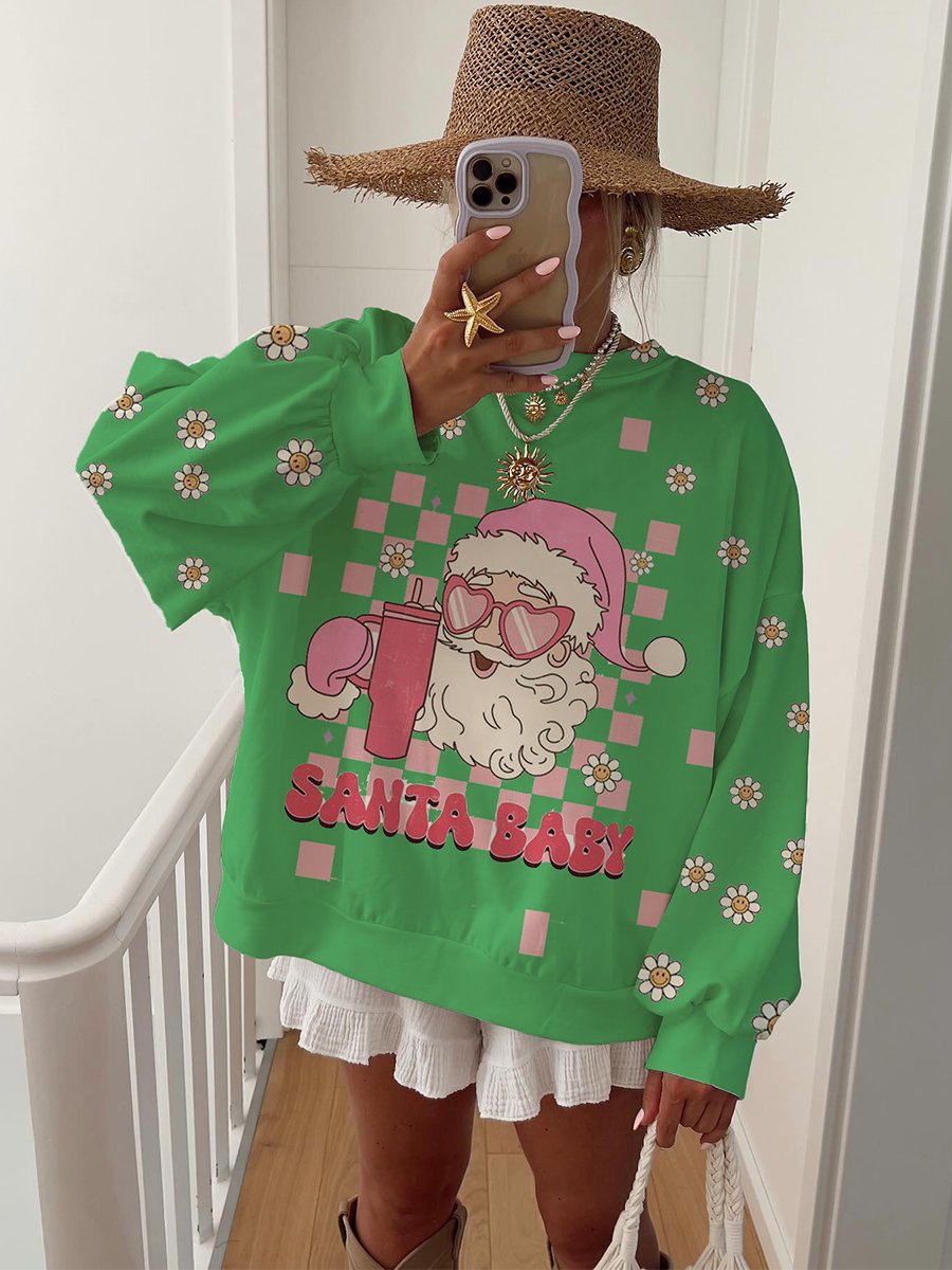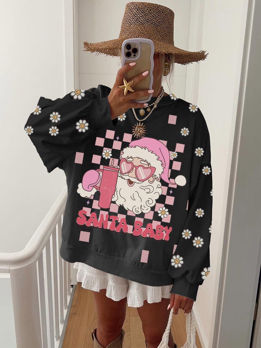 Women's Funny Daisy Santa Pattern Round Neck Long Sleeve Sweatshirt