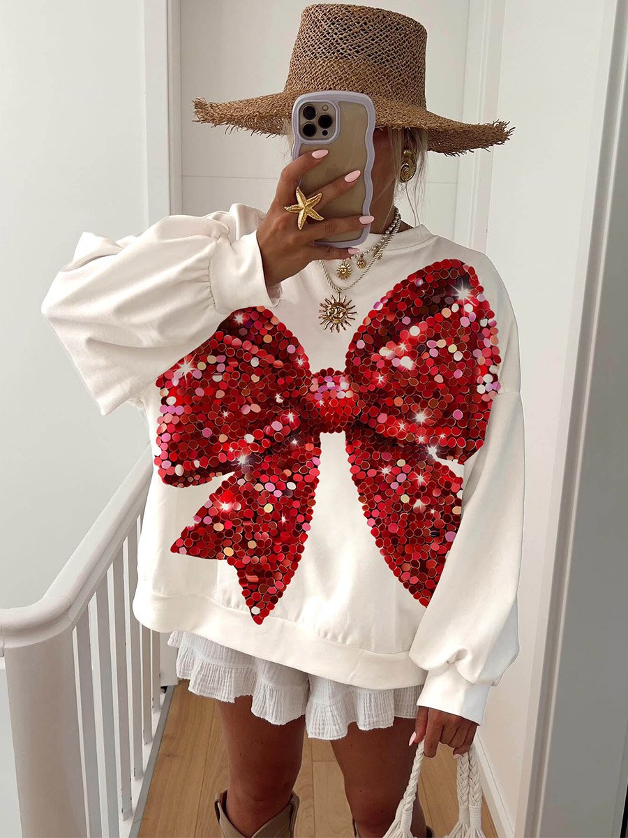 Women's Glitter Sequins Red Bow Print Sweatshirt