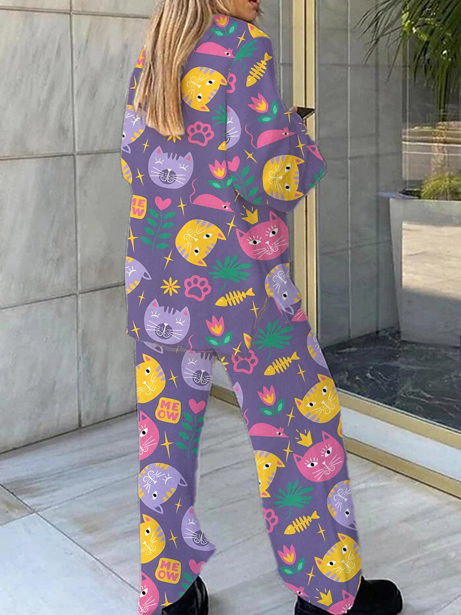 Women's Purple Cute Cat Print V-Neck Long Sleeve Suit